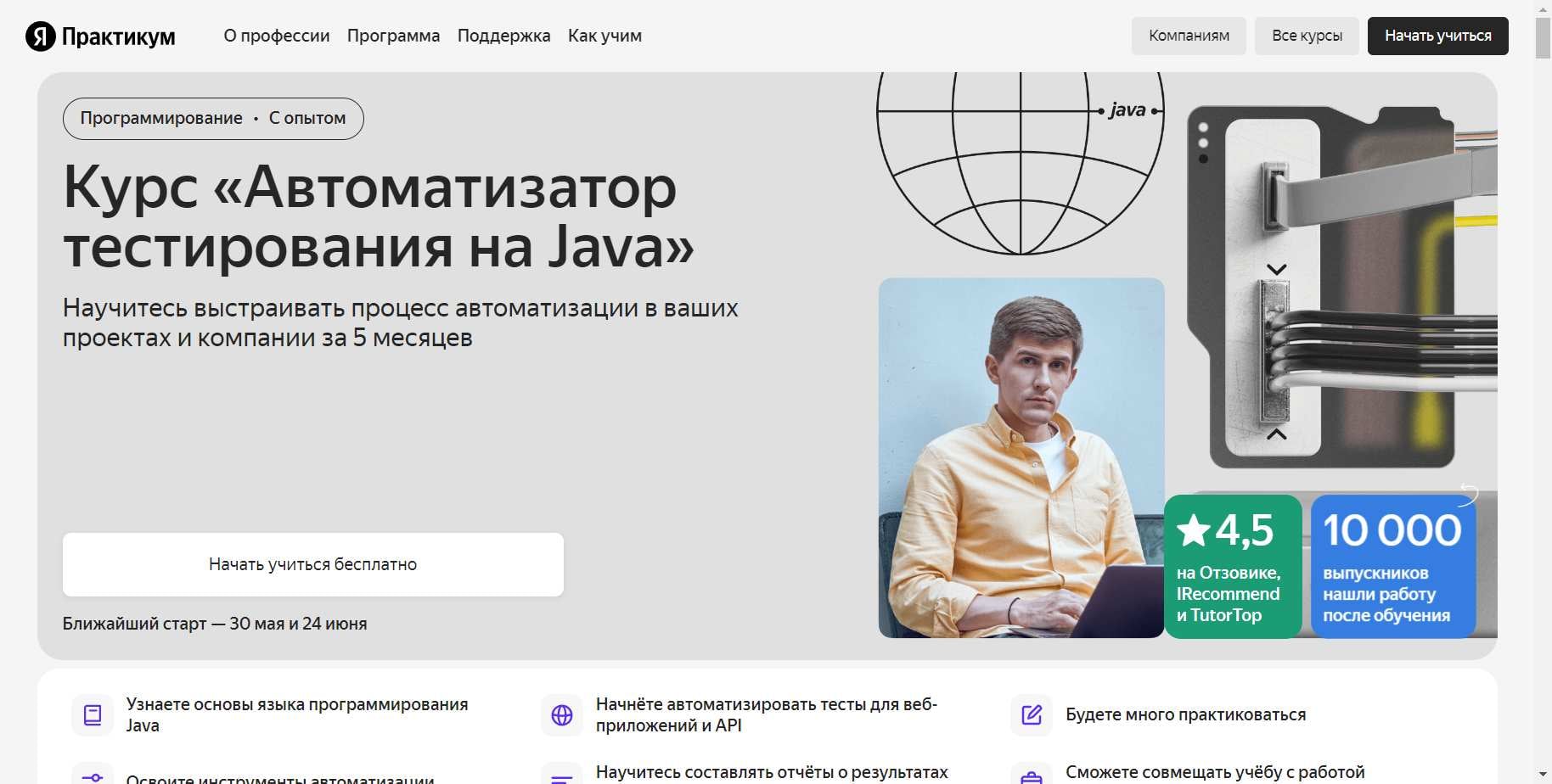 "Прошел курс «Автоматизатор тестирования на Java» на Яндекс Практикуме и остался доволен полученными знаниями. Программа обучения охватывает все основные аспекты автоматизации тестирования, начиная с основ Java и заканчивая практическими навыками работы с популярными инструментами. Благодаря курсу я смог улучшить свои навыки и перейти на новый уровень в карьере."