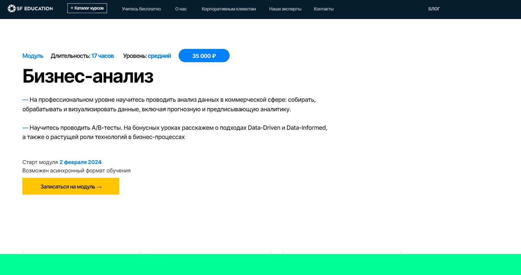 Длительность курса "Бизнес-анализ" составляет 17 часов. Вы можете выбрать между синхронным и асинхронным форматом обучения в зависимости от своего графика.