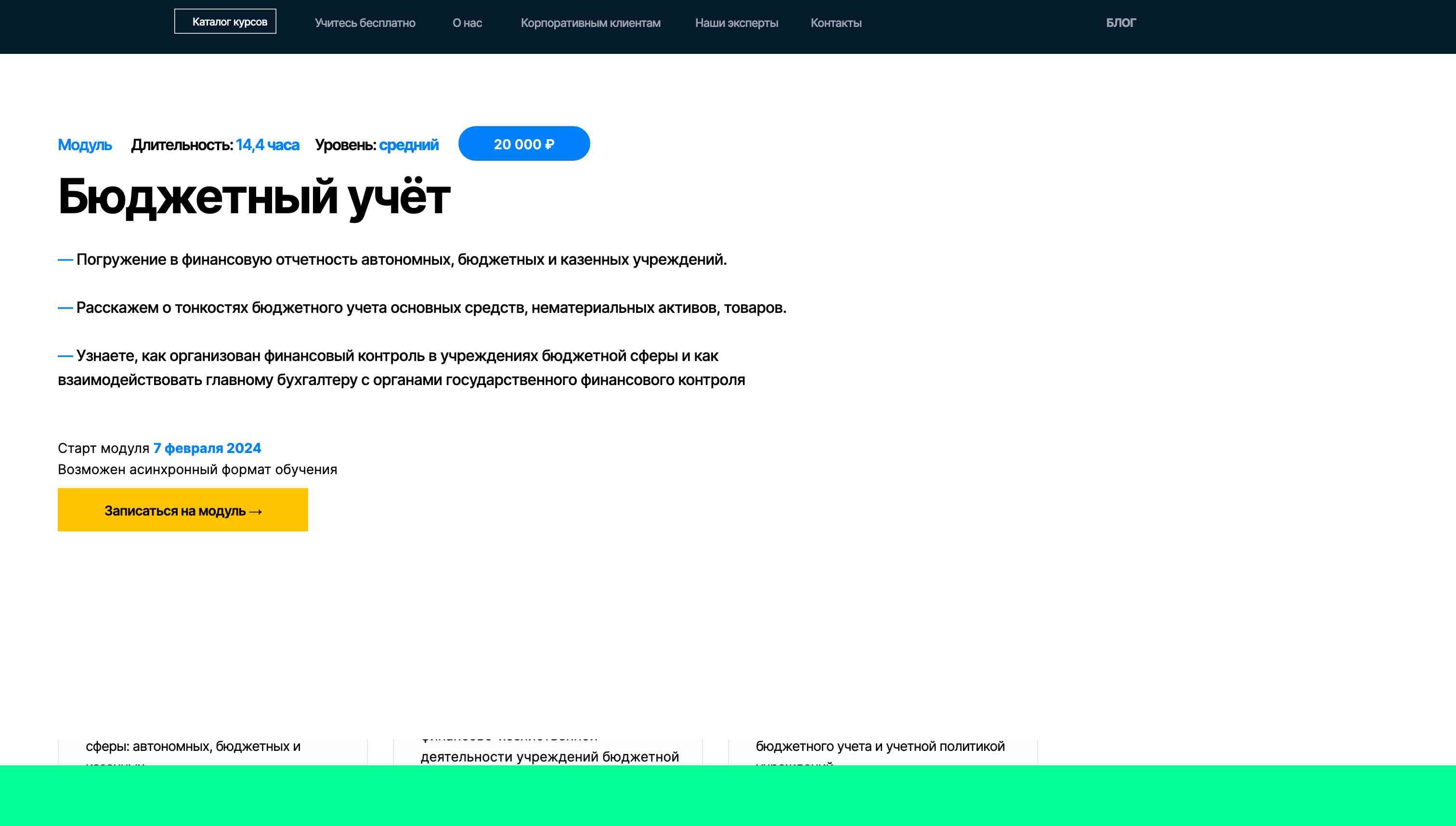 Старт модуля запланирован на 7 февраля 2024 года, и продолжительность составляет 14,4 часа. Вас ждет возможность выбора между синхронным и асинхронным форматом обучения, чтобы курс был максимально удобен для вас. Присоединяйтесь к SF Education и раскройте новые горизонты в бюджетном учете!