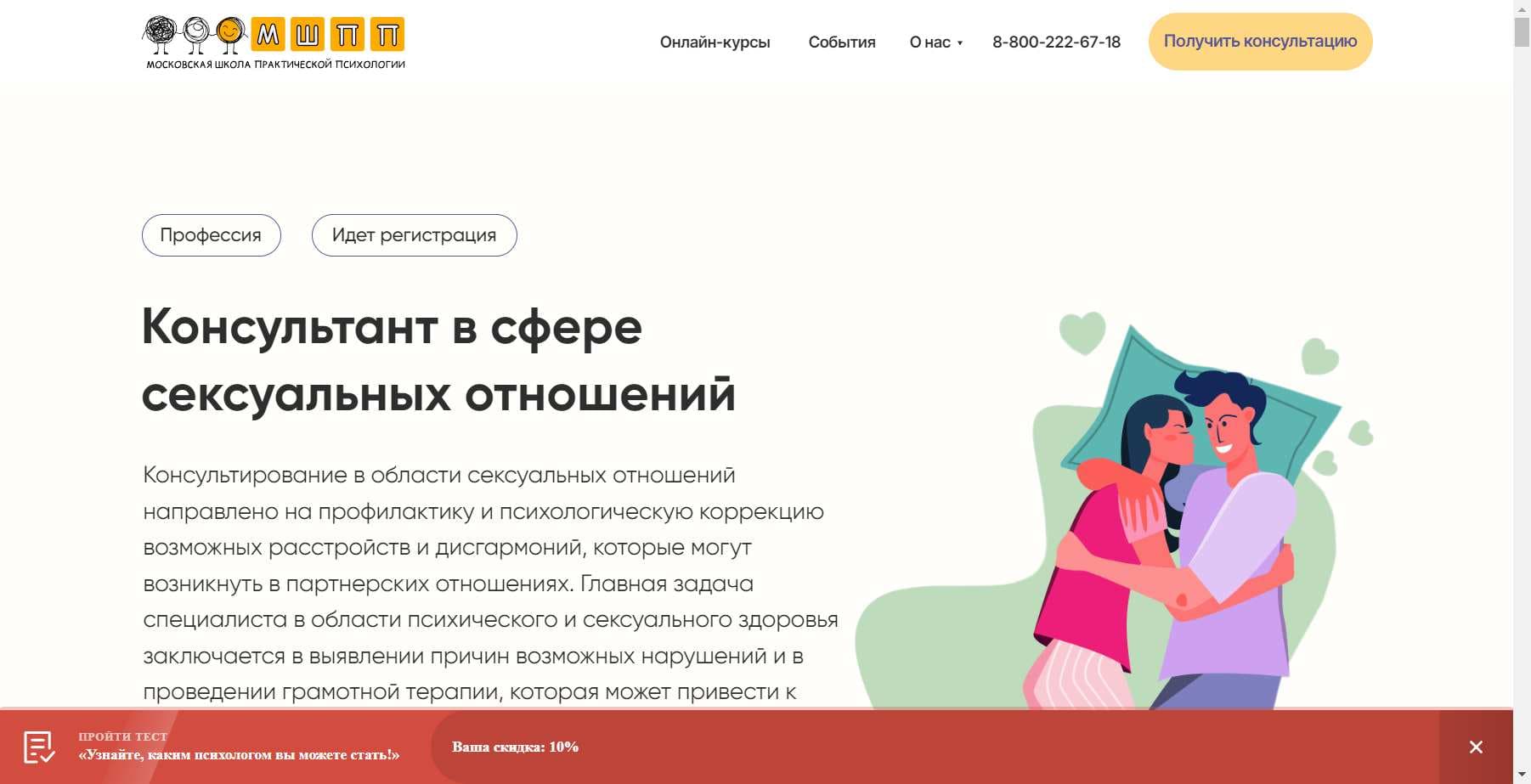 Для тех, кто решил приобрести курс "Консультант в сфере сексуальных отношений", доступен специальный промокод, который поможет сэкономить на покупке. Используя промокод KURSGID при оплате, вы получите скидку в размере 10% от стоимости курса.