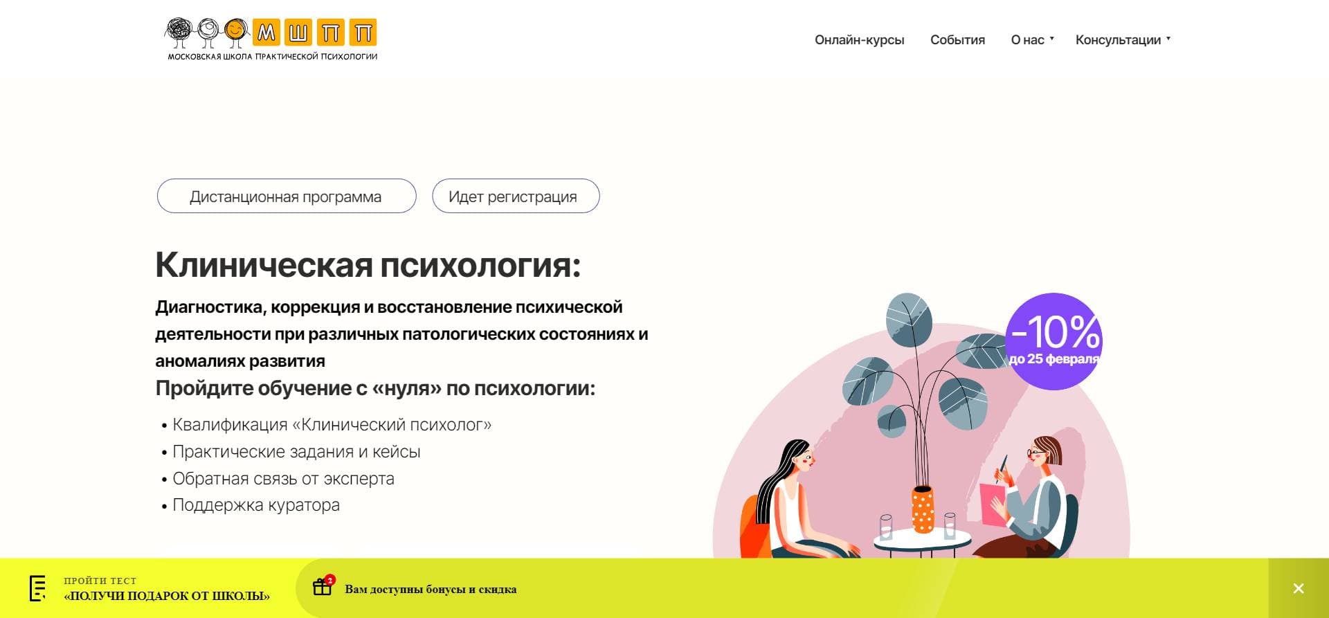 Хотите начать свой путь в клинической психологии с выгодой? Мы рады предложить вам эксклюзивный промокод KURSGID, который дает вам скидку 10% на покупку курса "Диагностика, коррекция и восстановление психической деятельности" в Московской школе практической психологии (МШПП).