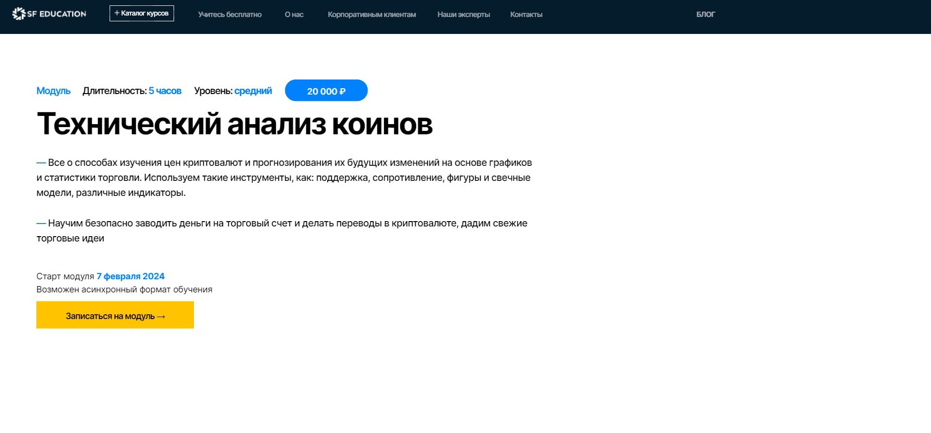 Программа курса ориентирована на студентов среднего уровня подготовки и предоставляет пять часов интенсивных занятий. Старт модуля назначен на 7 февраля 2024 года, и, что особенно удобно, доступен асинхронный формат обучения. Приглашаем вас присоединиться к нам и раскрыть потенциал технического анализа коинов.
