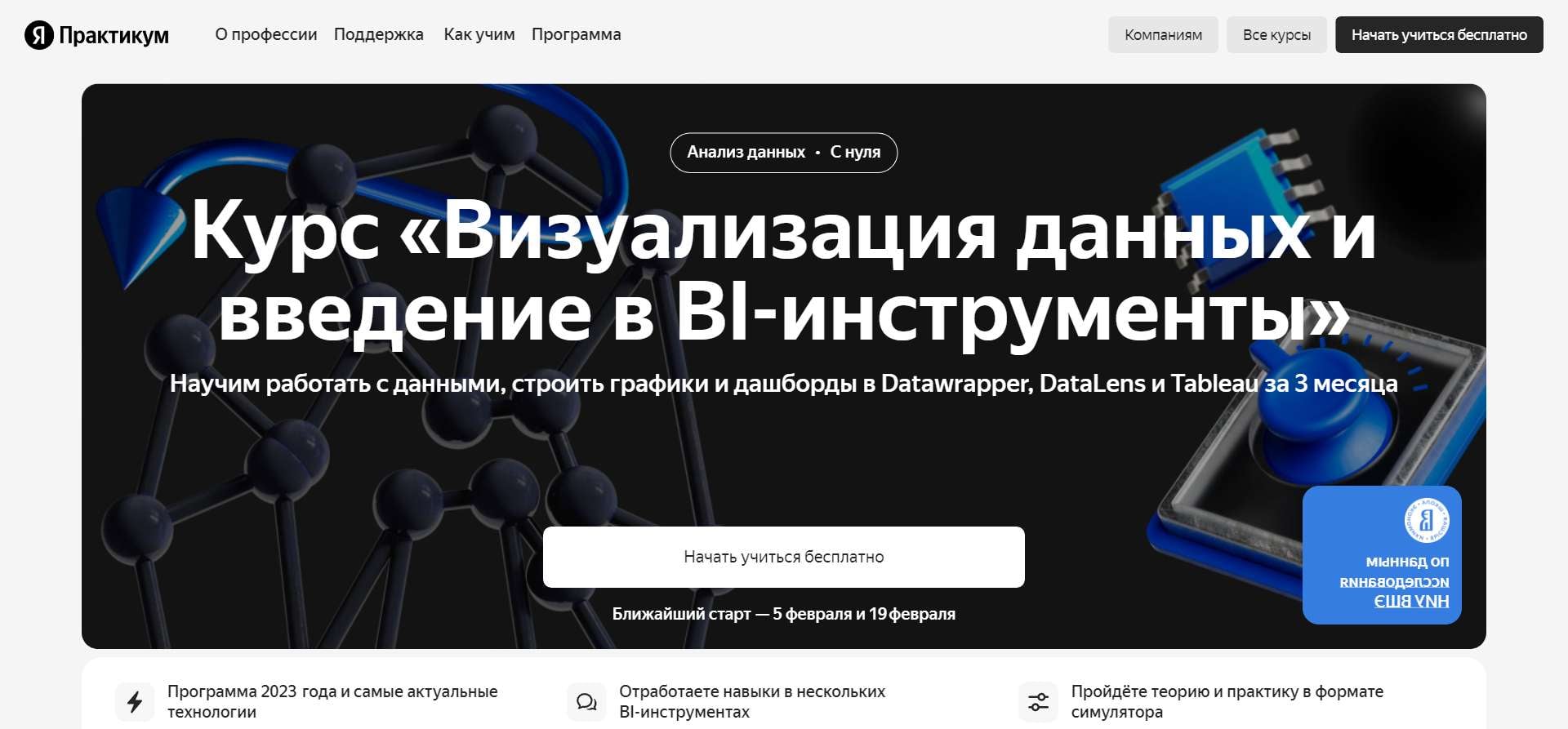 Этот курс предоставляет не только теоретические знания, но и ценный практический опыт в симуляторе. На ближайших стартах 5 и 19 февраля, вы сможете начать свой путь к владению Datawrapper, DataLens и Tableau. С более чем 10 000 успешных выпускников и высоким рейтингом на Отзовике, IRecommend и TutorTop, курс Яндекс Практикум – это не просто обучение, но и возможность взлететь в мире данных. Поднимите свою аналитическую карьеру на новый уровень с нашим курсом "Визуализация данных и введение в BI-инструменты".