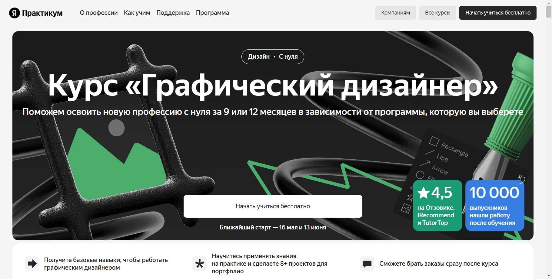 Курс «Графический дизайнер» от Яндекс Практикум — это уникальная возможность получить профессию с нуля и освоить ее за 9 или 12 месяцев, в зависимости от выбранной программы обучения. Подходит для тех, кто хочет сменить карьеру и начать свой путь в мире дизайна, а также для тех, кто желает углубить свои знания в этой сфере.
