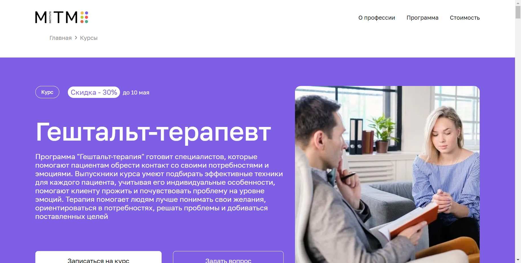 Если вы планируете поступить на курс гештальт-терапии в Московском институте технологий и управления, у вас есть возможность сэкономить 15% на стоимости обучения. Для этого достаточно воспользоваться промокодом Partners15 при оформлении заявки.