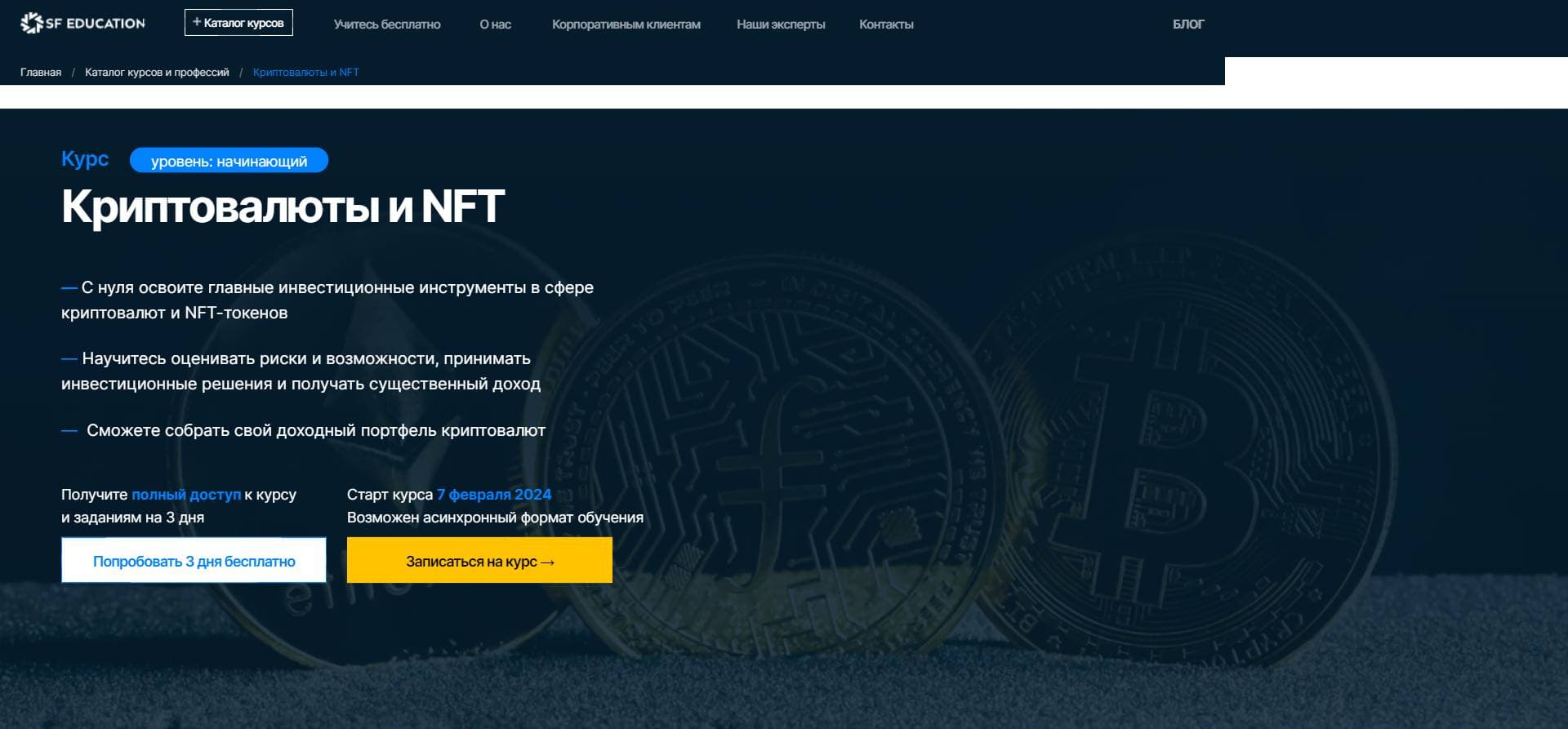 Хотите получить качественное обучение по криптовалютам и NFT по выгодной цене? Воспользуйтесь уникальным промокодом EDP2023 при оплате обучения на курсе "Обучение Криптовалюте и NFT с нуля" от SF Education и получите скидку 60%.