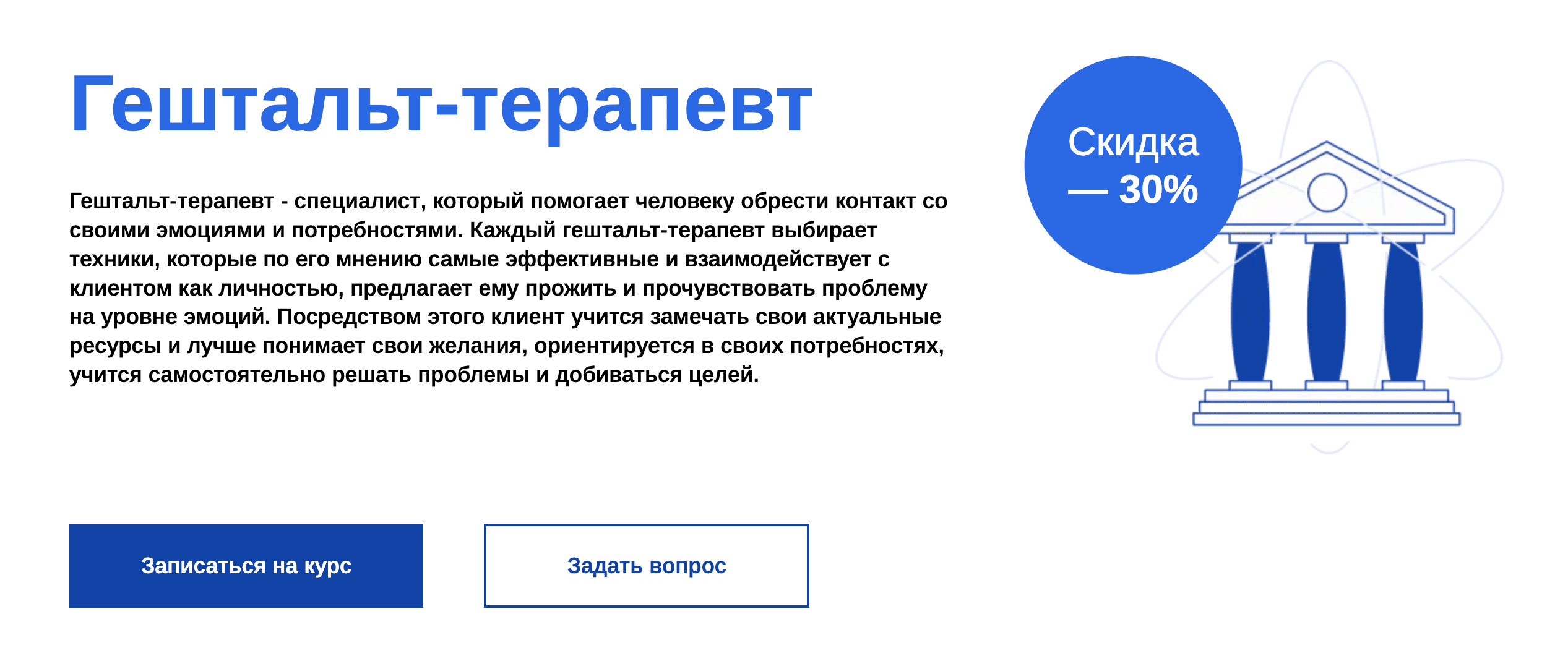 Сфокусированный курс: Курс "Гештальт-терапевт" специализируется на гештальт-терапии, что обеспечивает студентам глубокое и полное понимание этой методики и подготавливает их к успешной практике.