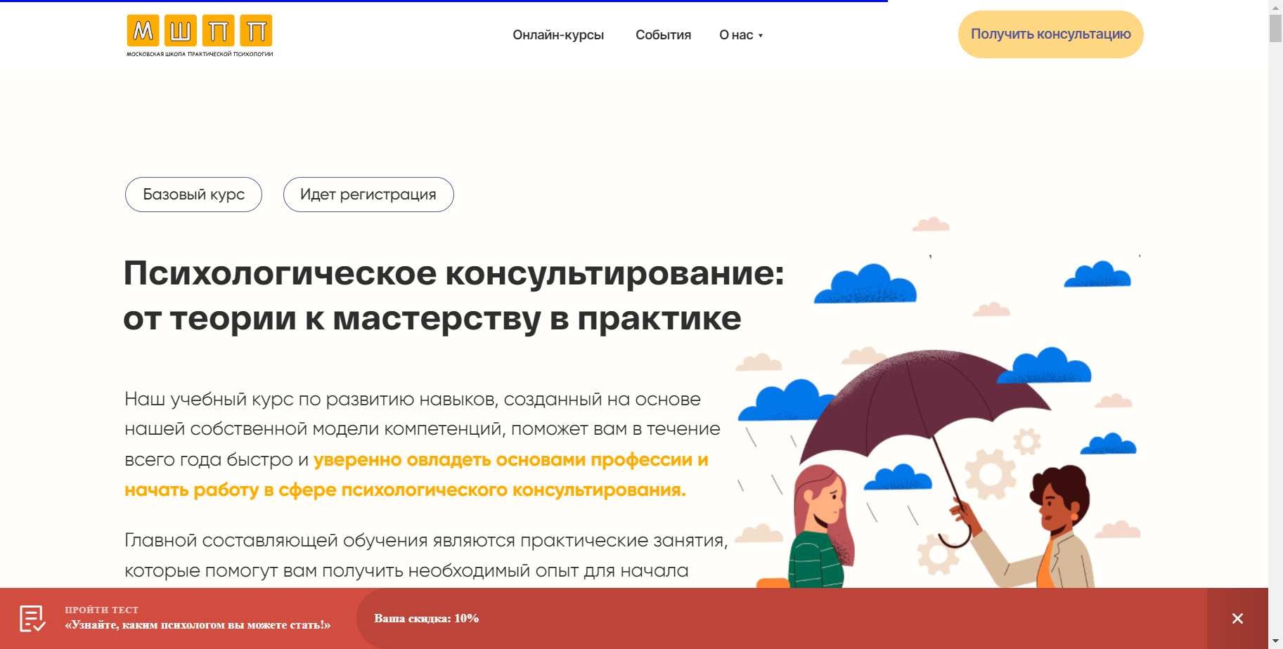 Хотите сэкономить на обучении и получить ценные знания по психологическому консультированию? У нас есть отличная новость для вас! Используйте промокод "KURSGID" и получите скидку 10% на курс "Психологическое консультирование: от теории к мастерству в практике" в Московской школе практической психологии.
