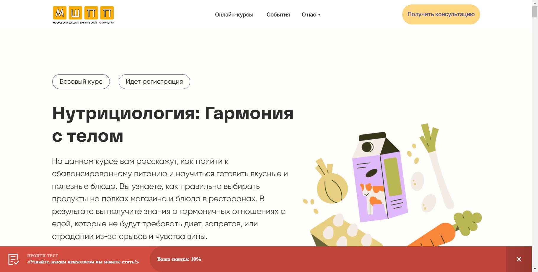 Для тех, кто заинтересован в прохождении курса «Нутрициология», Московская Школа Практической Психологии предлагает выгодную возможность сэкономить на покупке. При использовании промокода KURSGID вы получаете скидку в размере 10% на стоимость курса.