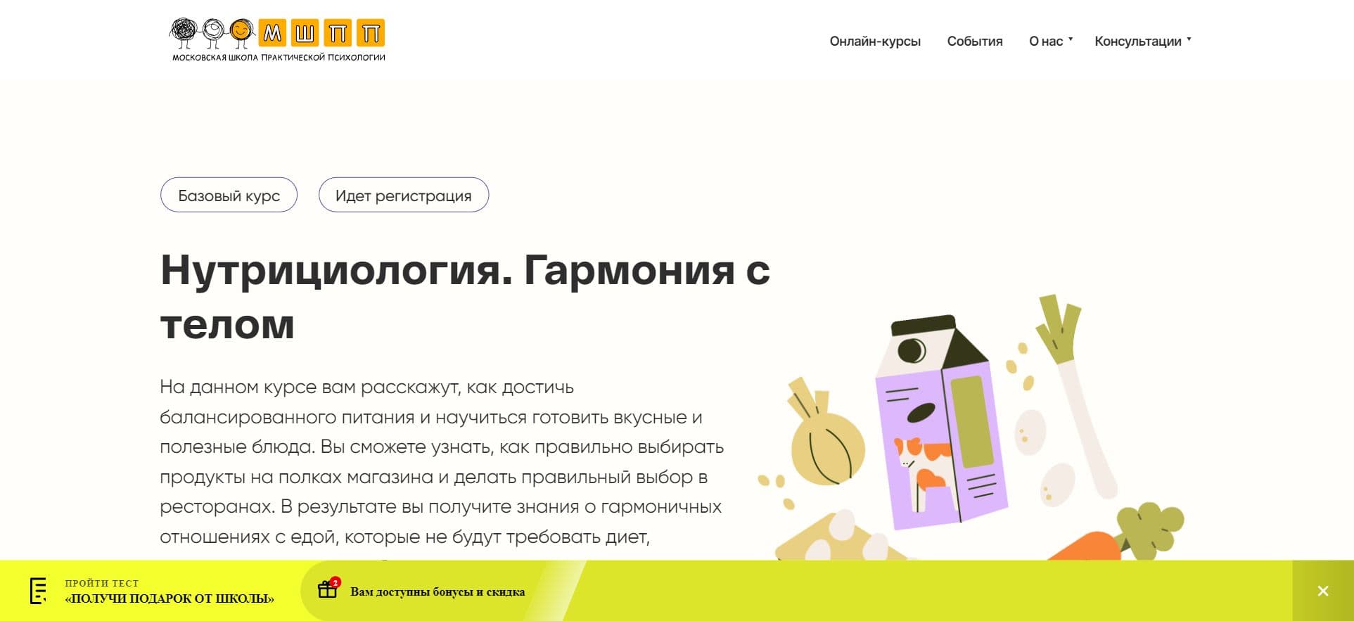 Курс "Нутрициология" в Московской Школе Практической Психологии представляет собой уникальную возможность погрузиться в мир здорового питания и гармоничных отношений с едой. Здесь вы не только получите фундаментальные знания о питании и его влиянии на организм человека, но и научитесь применять их на практике. Вы услышите отзывы наших довольных выпускников, ознакомитесь с эксклюзивным промокодом на скидку 10% на обучение и найдете ответы на самые часто задаваемые вопросы в разделе FAQ.