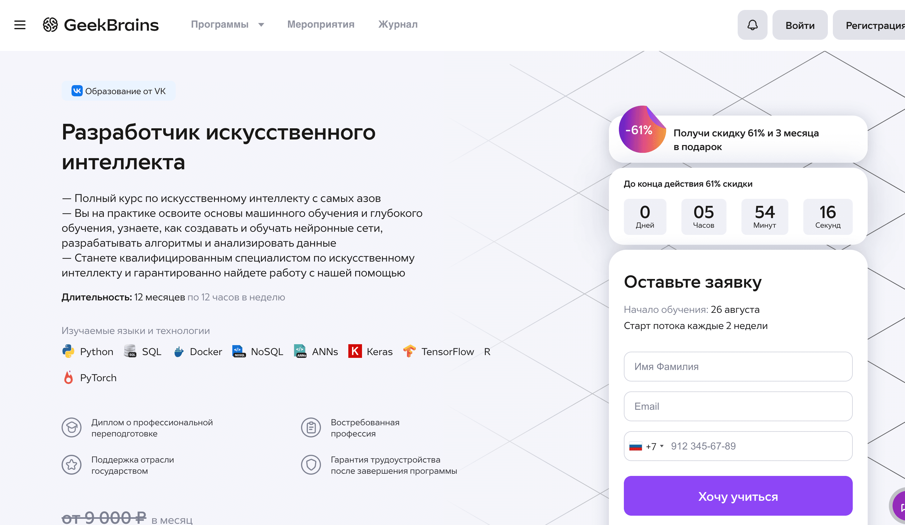 1. Курс "Разработчик искусственного интеллекта" от GeekBrains