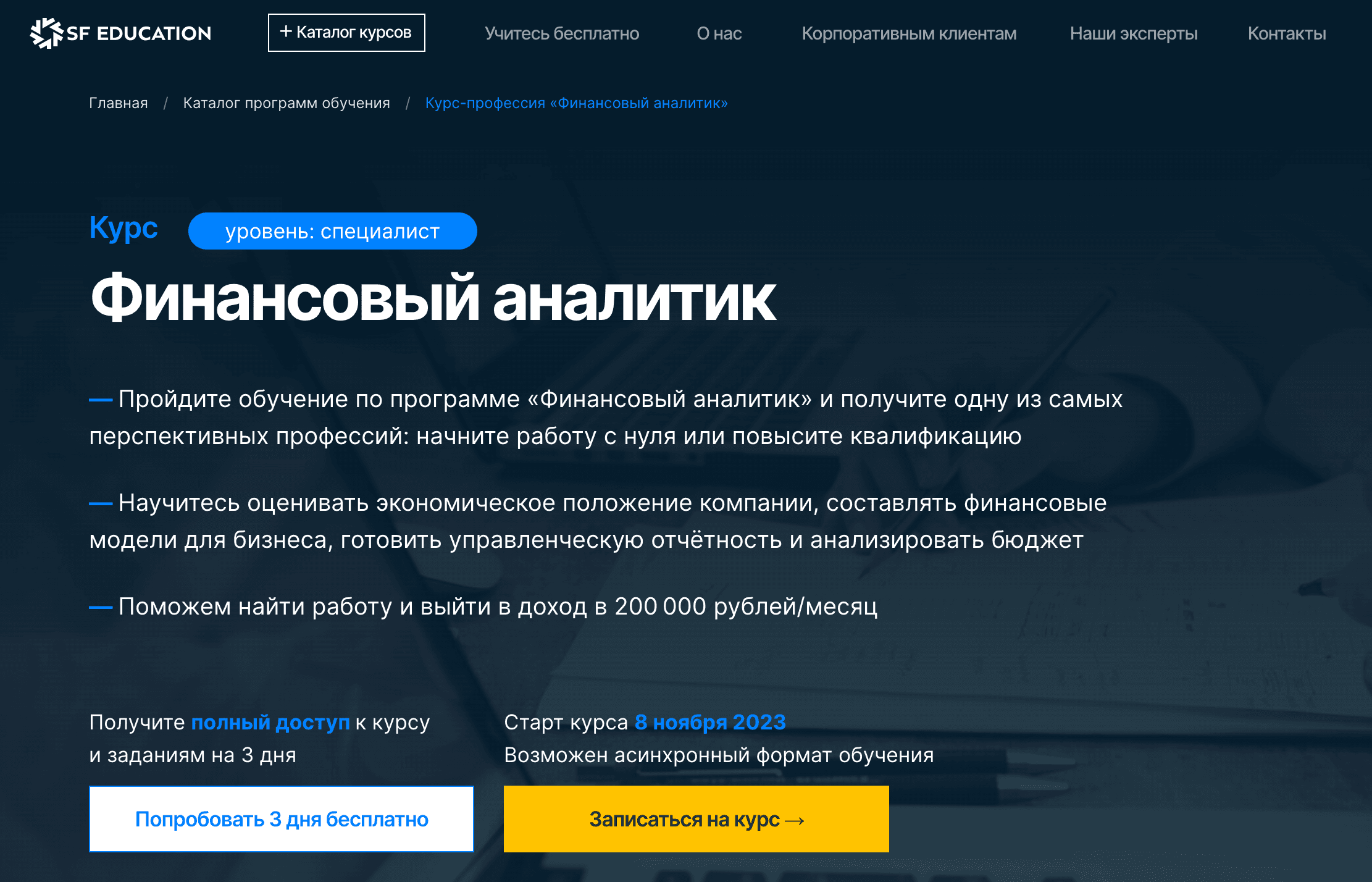 В целом, курс "Финансовый аналитик" от SF Education предоставляет отличные возможности для тех, кто желает углубить свои знания и навыки в области финансового анализа и достичь успеха в этой области. Не упустите шанс инвестировать в свое будущее и начать путь к профессиональному росту.