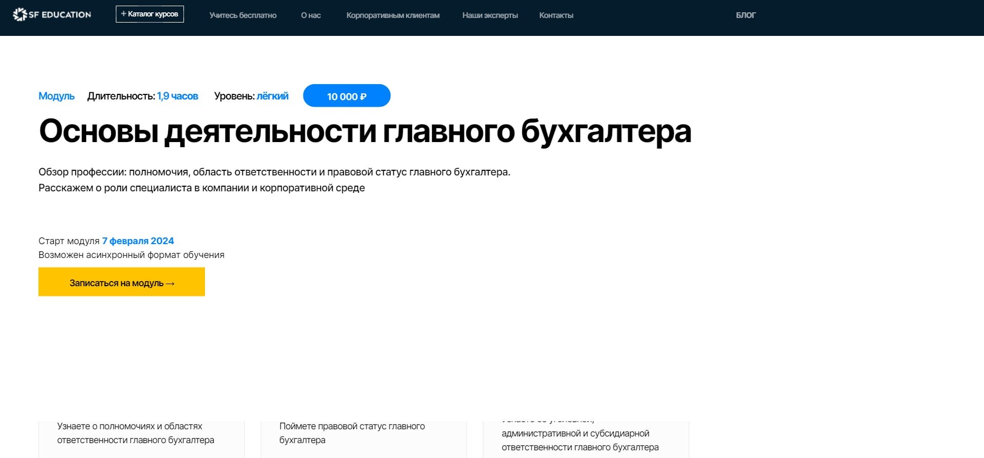 Кроме того, вас ожидает обзор роли главного бухгалтера в компании и корпоративной среде. Курс SF Education предоставляет не просто теоретические знания, а возможность взаимодействия с действующим главным бухгалтером, что придает учебному процессу практическую направленность. Длительность модуля составляет 1,9 часа, обеспечивая легкость усвоения материала. Важно отметить, что старт модуля намечен на 7 февраля 2024 года, и предусмотрен асинхронный формат обучения, что позволяет вам самостоятельно выбирать удобное время для обучения.