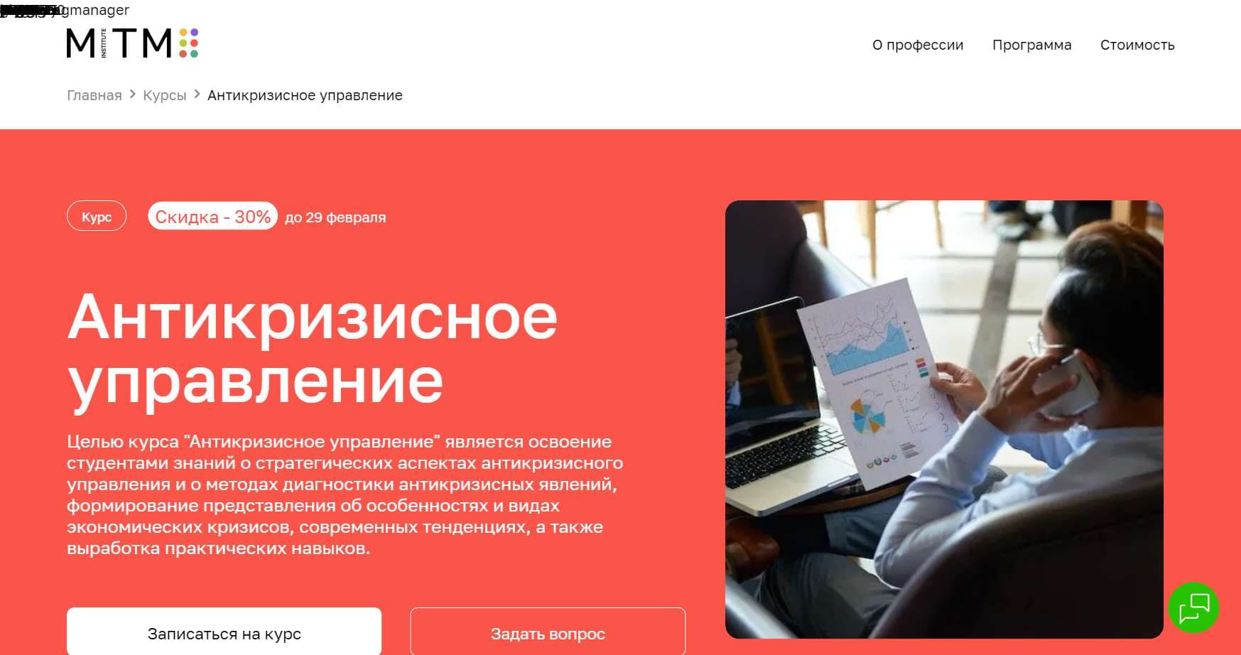 Курс "Антикризисное управление" от Московского Института Технологий и Управления представляет собой уникальную возможность для менеджеров, стремящихся овладеть ключевыми знаниями в сфере стратегического управления в условиях экономических кризисов. Этот онлайн-курс, предоставляемый в дистанционном формате, отличается не только высоким уровнем актуальности, но и привлекательной скидкой в размере 30% для ранних поступающих до 29 февраля.