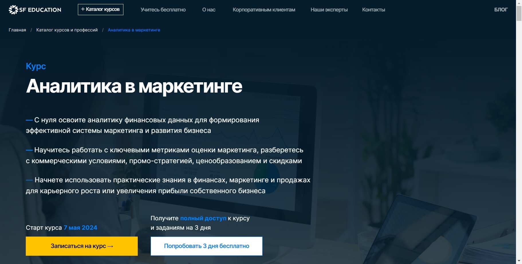 Курс "Аналитика в маркетинге" от SF Education представляет собой уникальную возможность для тех, кто стремится глубже понять механизмы анализа данных в контексте маркетинга. Этот курс разработан специально для тех, кто хочет улучшить свои навыки в аналитике и применить их в мире маркетинга и бизнеса.