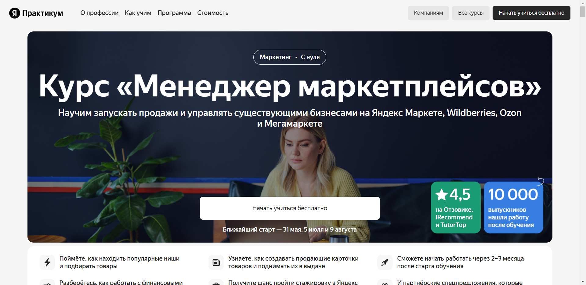 Яндекс Практикум предлагает современные и актуальные курсы, в том числе курс «Менеджер маркетплейсов». Особенностью Я.Практикум является то, что здесь все учебные программы разрабатываются с учетом требований рынка труда и реальных потребностей работодателей. Это обеспечивает выпускникам возможность быстро найти работу после завершения обучения.