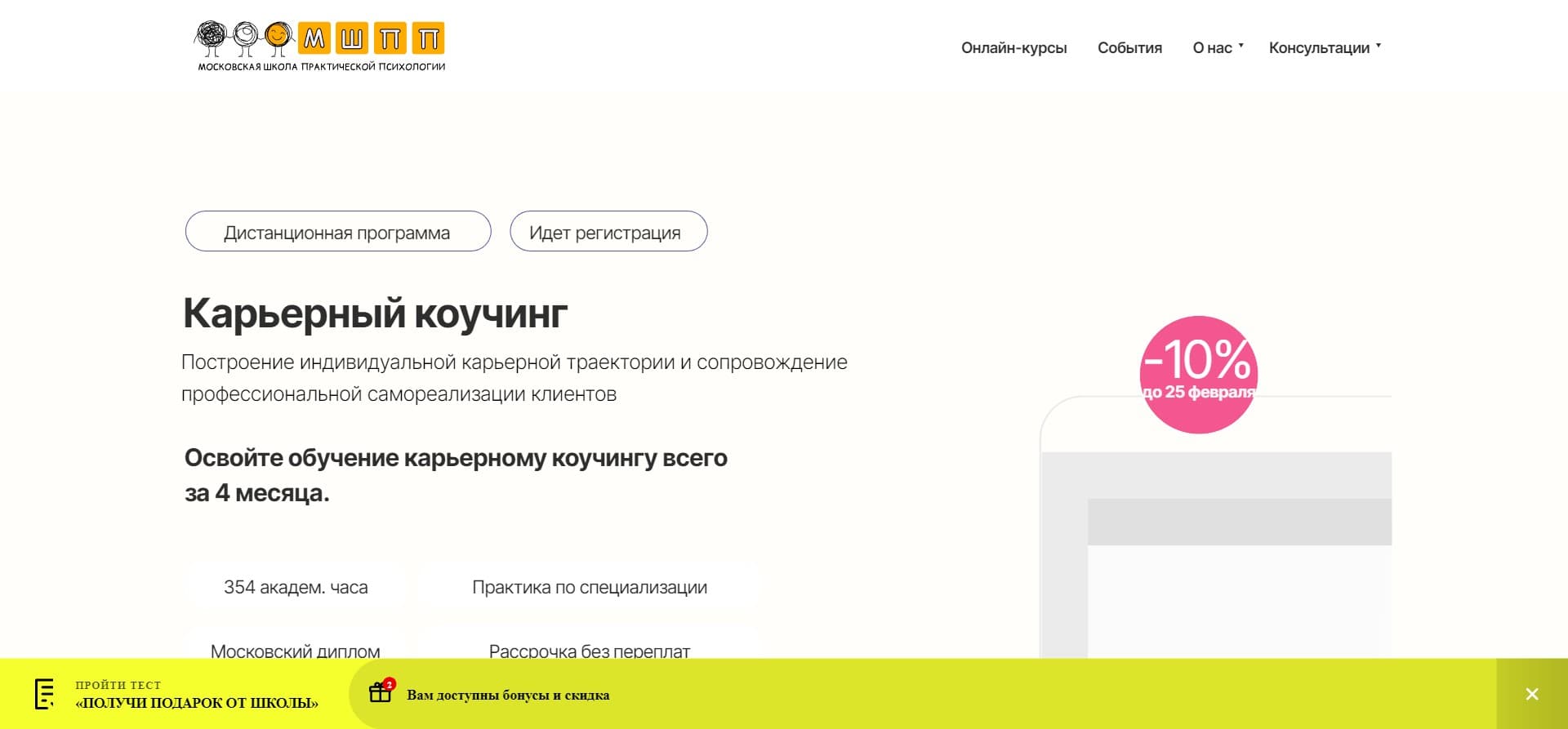 Хотите получить доступ к курсу "Карьерный коуч и консультирование" от Московской Школы Практической Психологии со скидкой? Тогда воспользуйтесь нашим эксклюзивным промокодом KURSGID, который дает вам возможность сэкономить 10% от стоимости обучения. Просто введите этот промокод при оформлении заказа, и скидка будет автоматически применена. Это отличная возможность получить качественное образование по выгодной цене и инвестировать в свое профессиональное развитие. Не упустите шанс стать успешным карьерным коучем и консультантом с помощью нашего курса и эксклюзивного промокода!