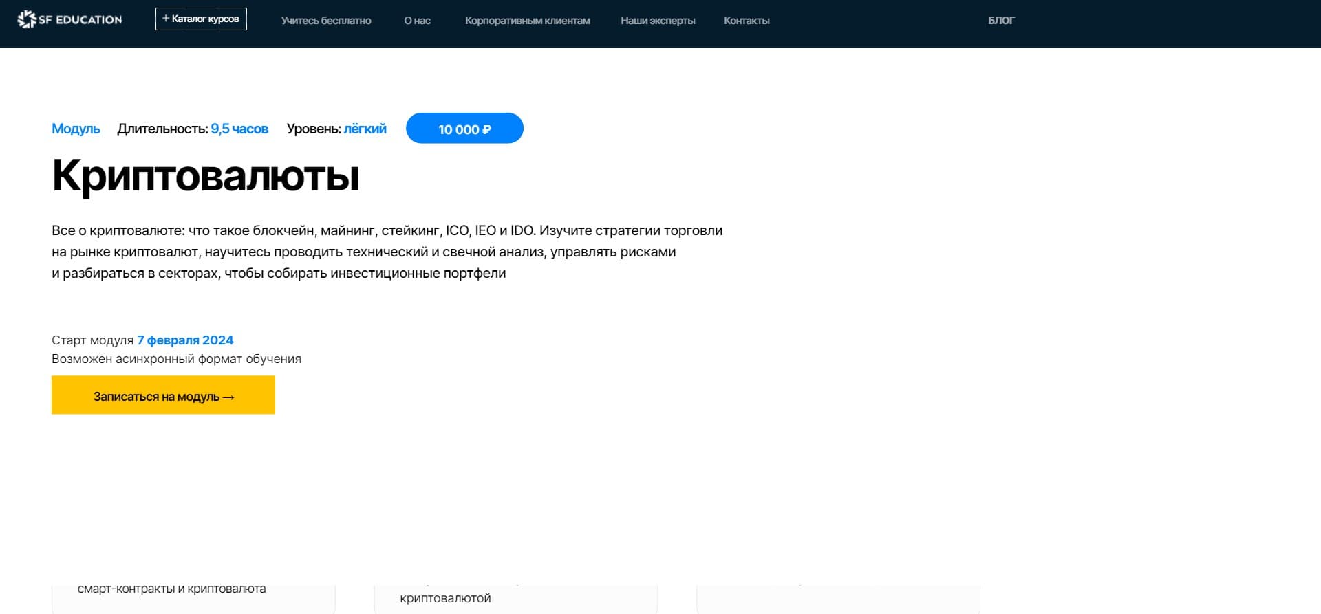Таким образом, курс "Криптовалюты" от SF Education представляет собой отличную возможность для всех, кто интересуется криптовалютами и желает расширить свои знания и навыки в этой области. Он сочетает в себе качественное обучение, гибкий формат и доступную цену, что делает его привлекательным выбором для тех, кто стремится к успеху на рынке криптовалют.