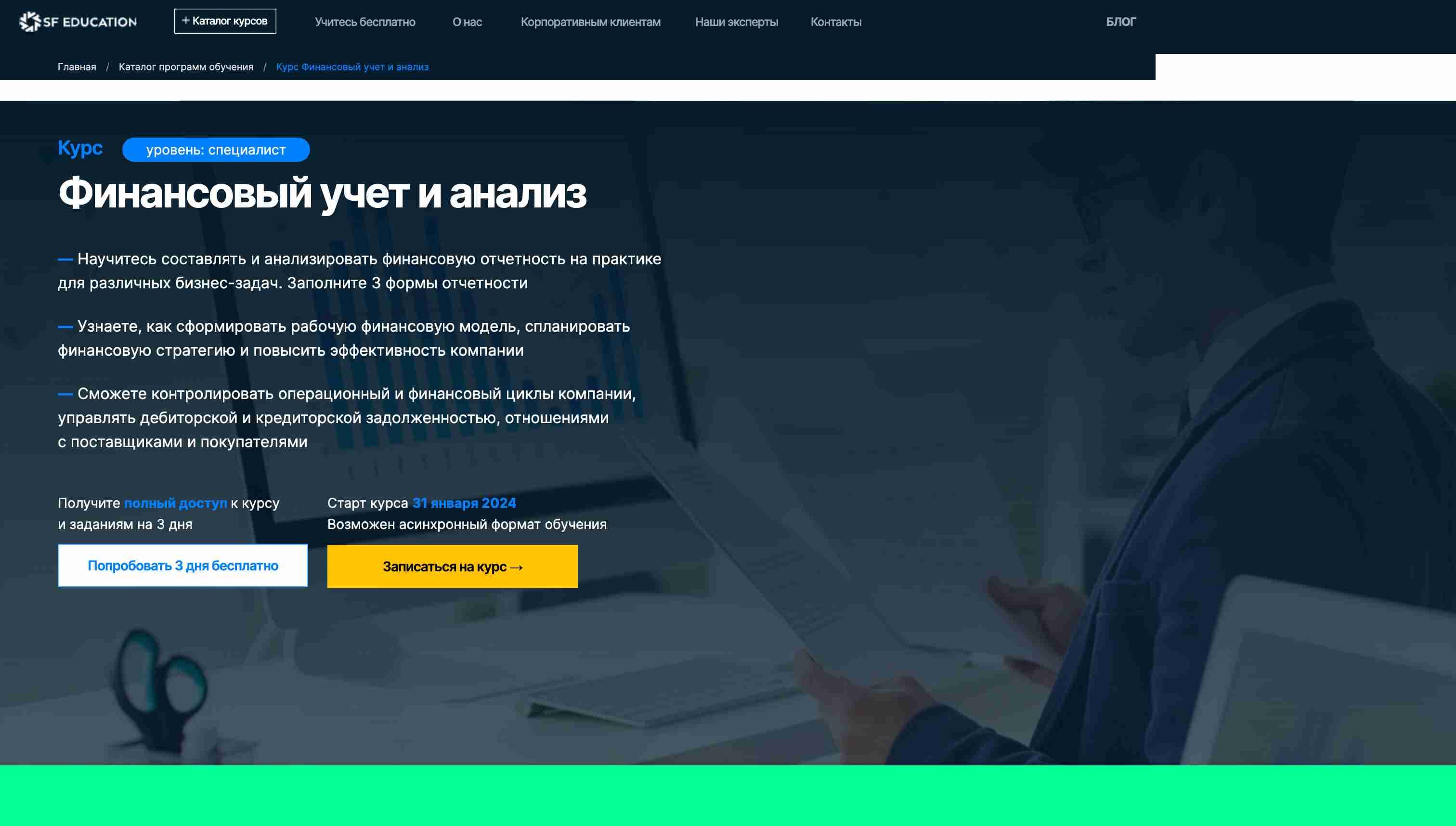 Первым шагом является выбор курса "Финансовый учет и анализ" на сайте SF Education. Удостоверьтесь, что это именно тот курс, который вас интересует.