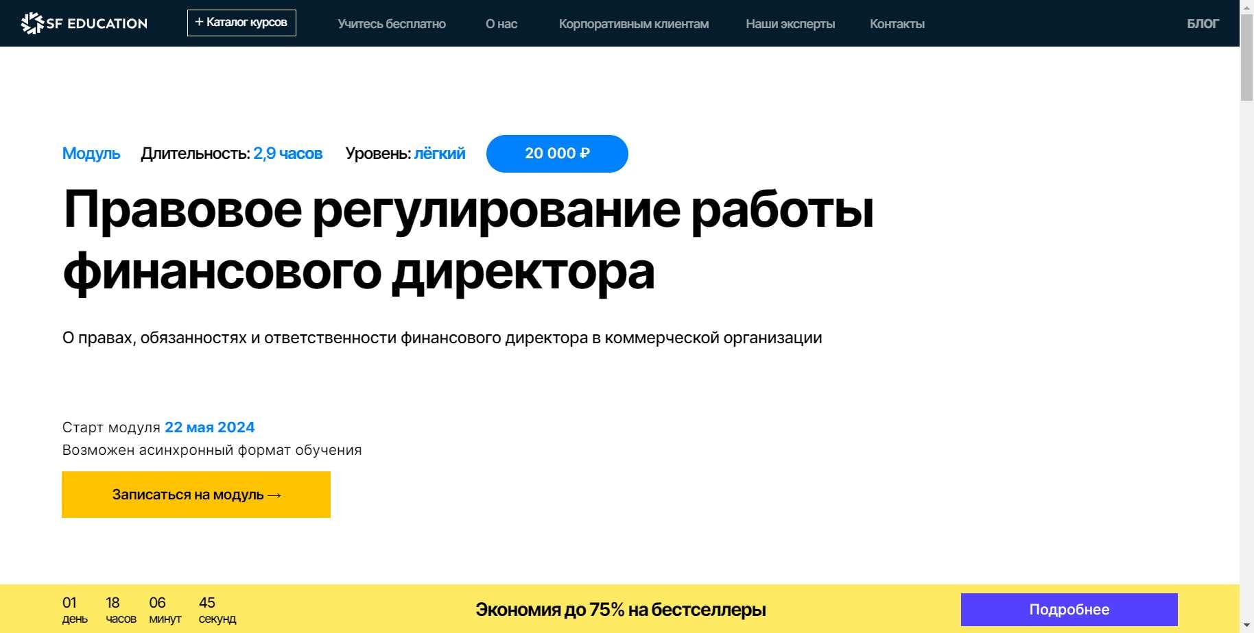 Курс "Правовое регулирование работы финансового директора" от SF Education отличается высоким качеством обучения, практической направленностью и возможностью личного общения с экспертами, делая его отличным выбором для тех, кто стремится к профессиональному успеху в области финансового управления.