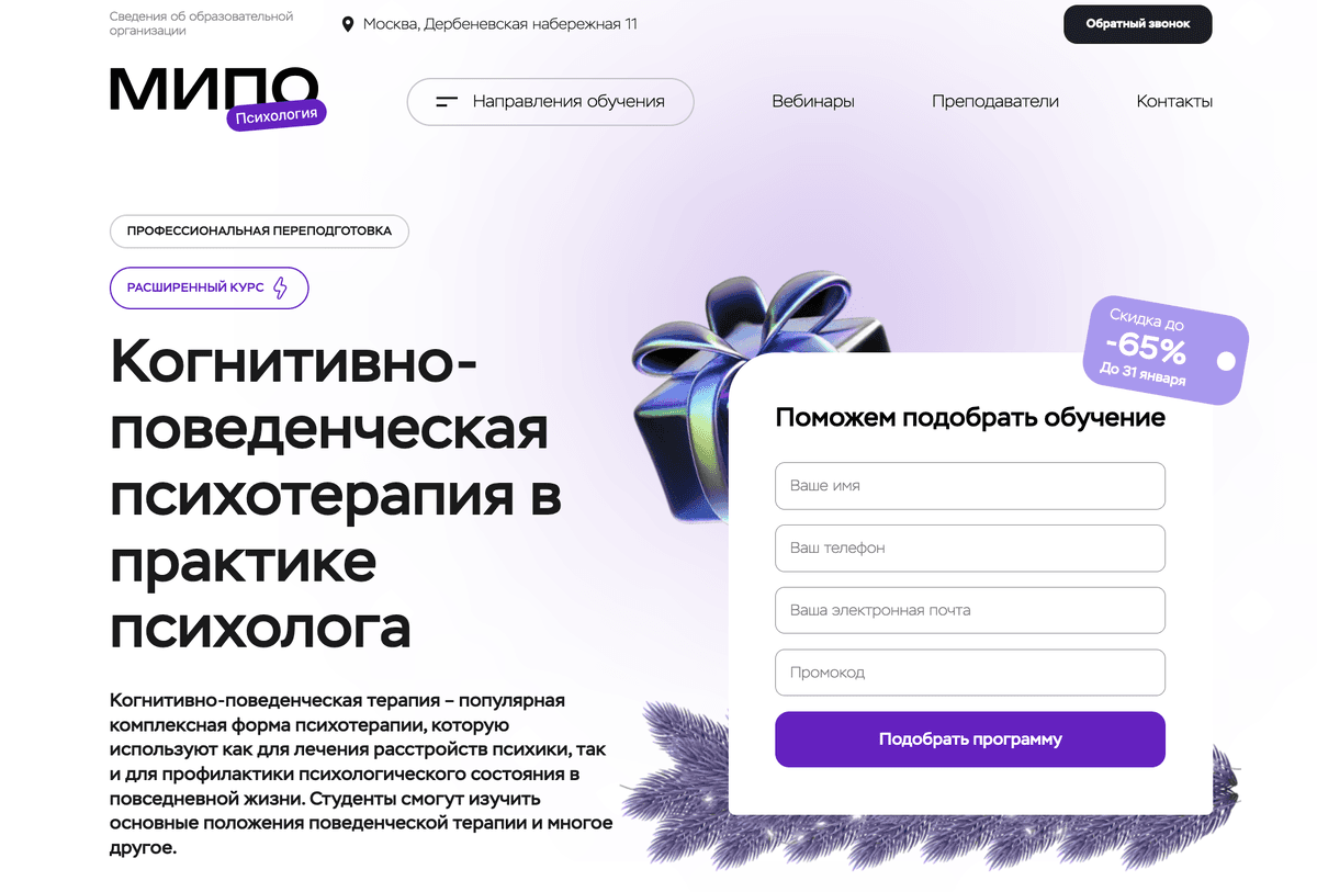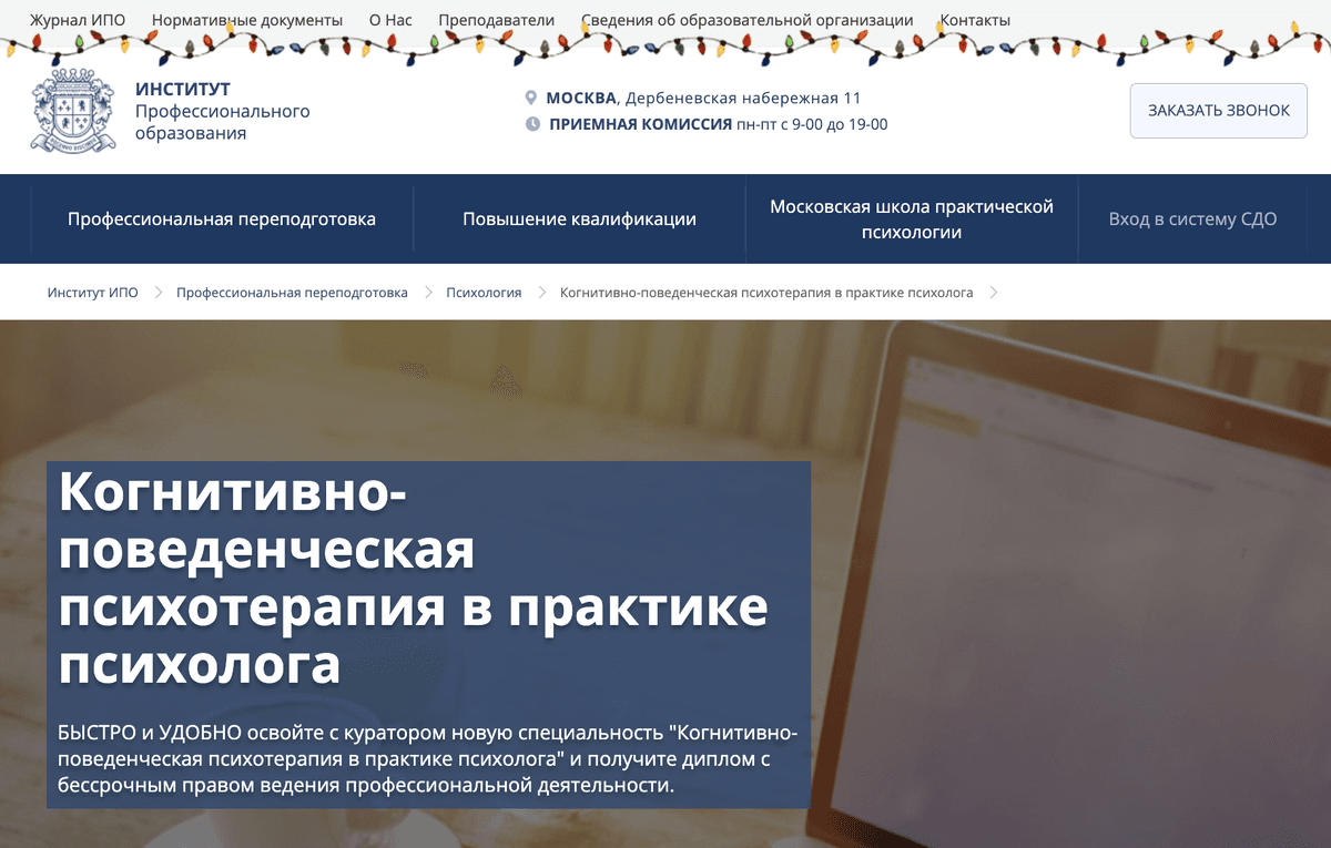 - Ссылка на программу: https://mipo.msk.ru/professions/Psychology/kognitivno-povedencheskaya-psihoterapiya-v-praktike-psihologa