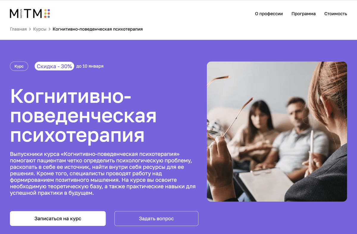 - Ссылка на программу: https://mitm.institute/kognitivno-povedencheskaya-psihoterapiya--kurs