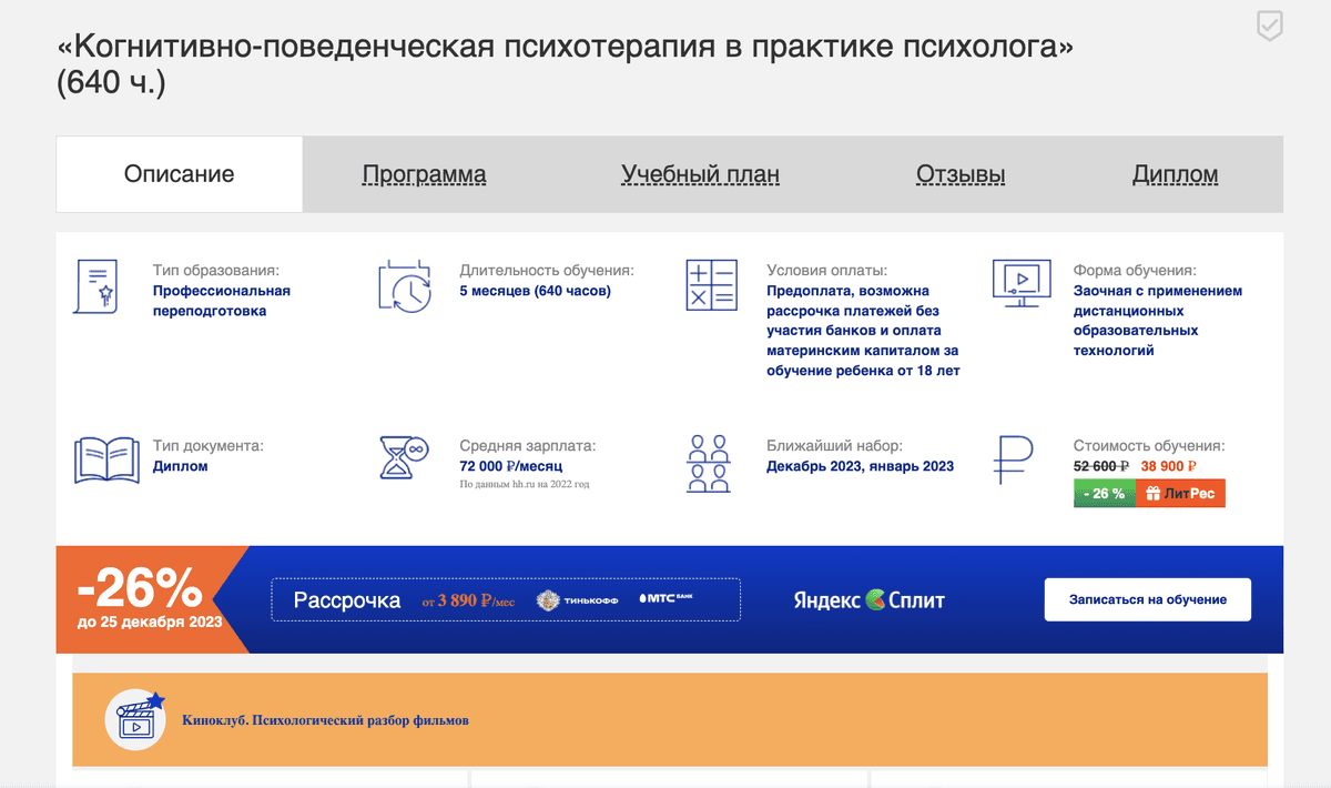 - Ссылка на программу: https://nadpo.ru/do/kognitivno-povedencheskaya-psikhoterapii-v-praktike-psikhologa/