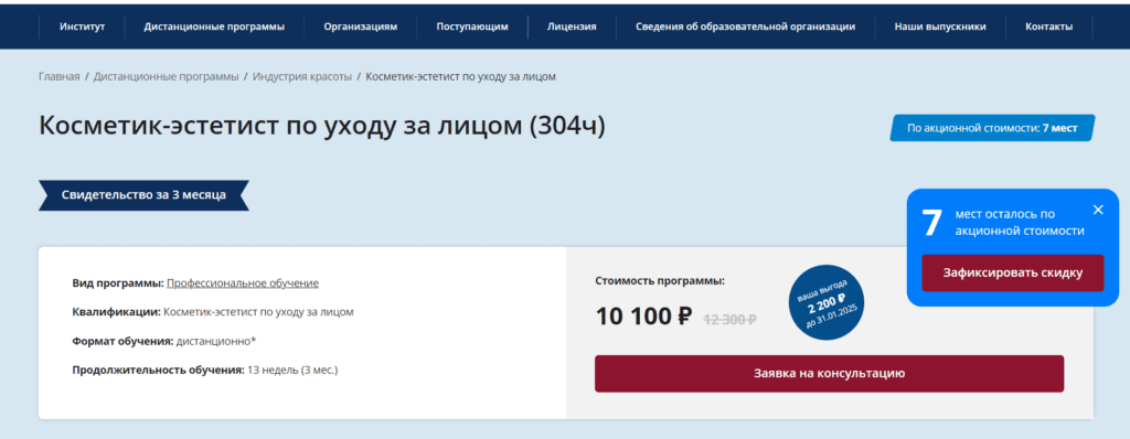 - Ссылка на программу: https://niidpo.ru/seminar/kosmetik-estetist-po-ukhodu-za-liczom