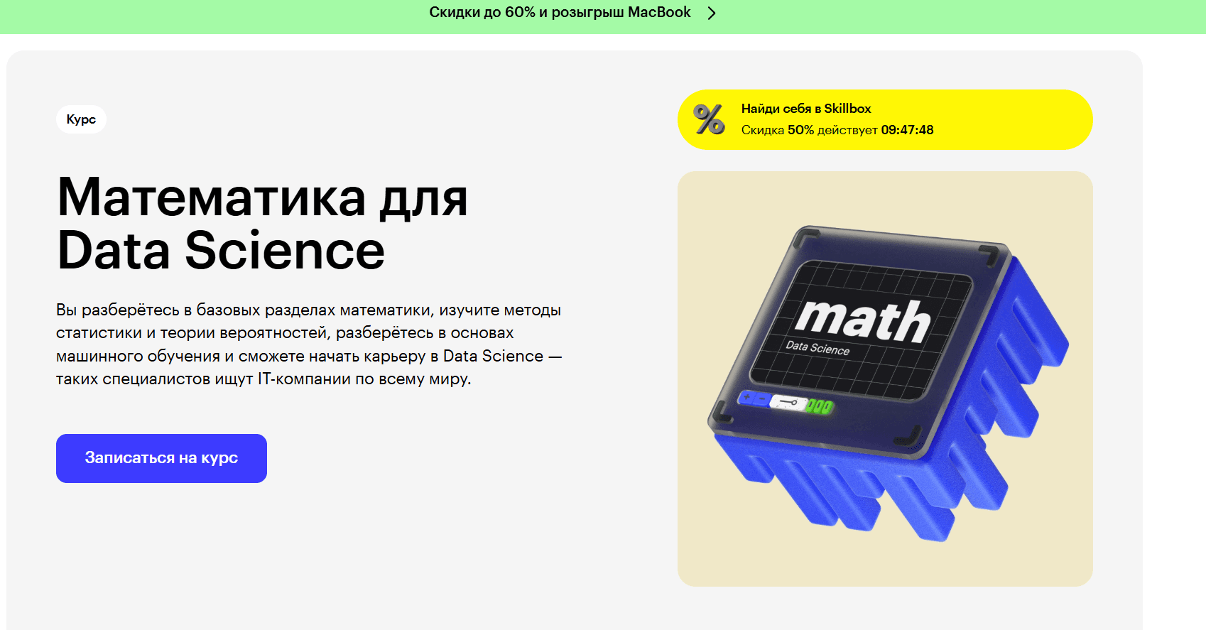 Курс от Skillfactory мне очень понравился тем, что он фокусируется на практическом применении математики для решения сложных задач анализа данных. Если вы уже не совсем новичок и целитесь на уровень "senior", этот курс, на мой взгляд, будет очень кстати для оттачивания навыков.