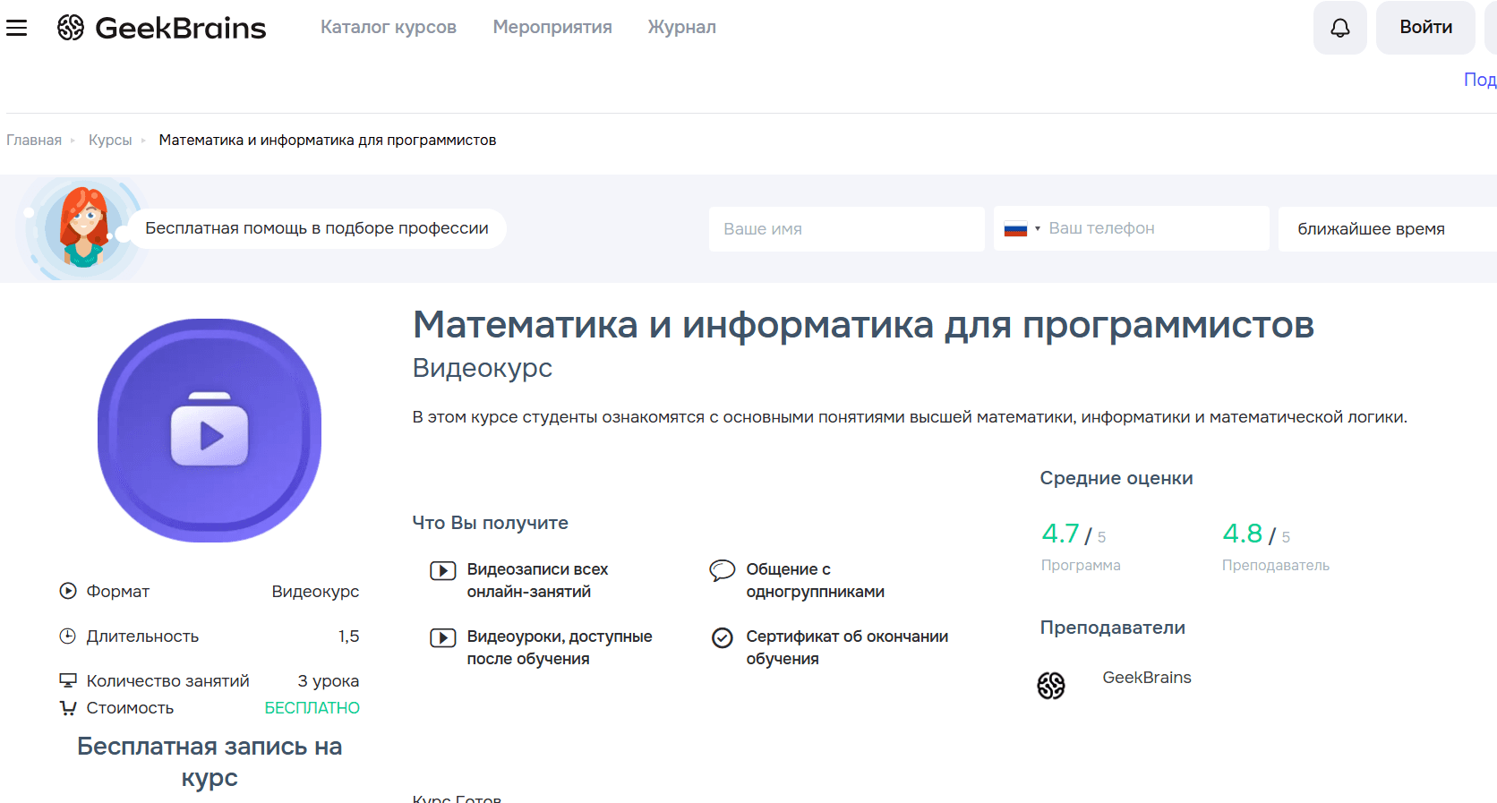 Этот бесплатный курс от GeekBrains стал хорошим стартом для меня, когда мне нужно было быстро освежить основные понятия. Он довольно сжатый, всего три урока, но дает очень четкое представление об основах высшей математики и логики, которые нужны именно программистам.