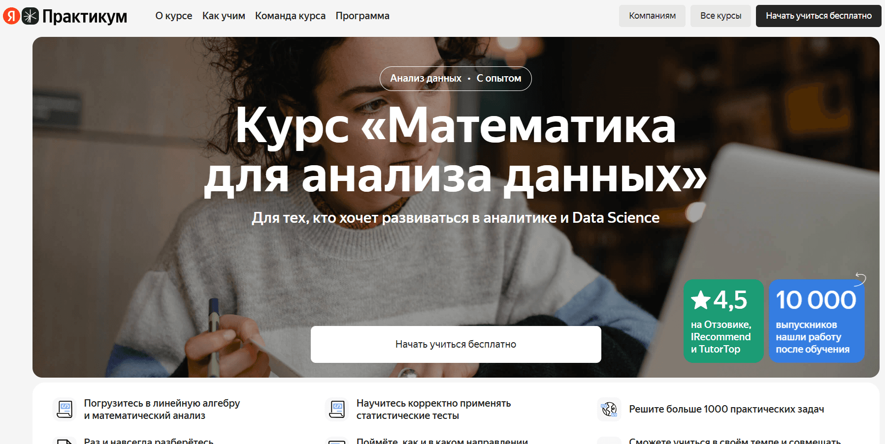 Центр "Специалист" всегда славился своим системным подходом к обучению. Их курс по математике для Data Science не исключение — он предлагает очень комплексный подход, охватывающий все необходимые разделы от базовых до более сложных. Я высоко ценю обилие практических заданий.