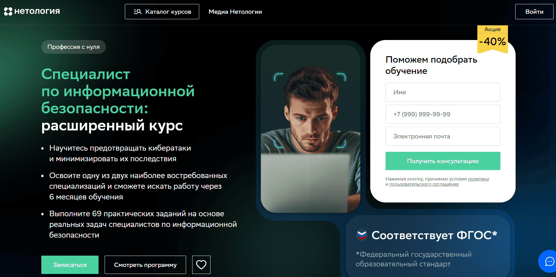 Программа Нетологии заинтересовала меня своей длительностью и широким спектром специализаций, включая DevSecOps и Pentest. Наличие документа о повышении квалификации или сертификата тоже плюс. Я узнала, что у них есть приятный бонус при записи.