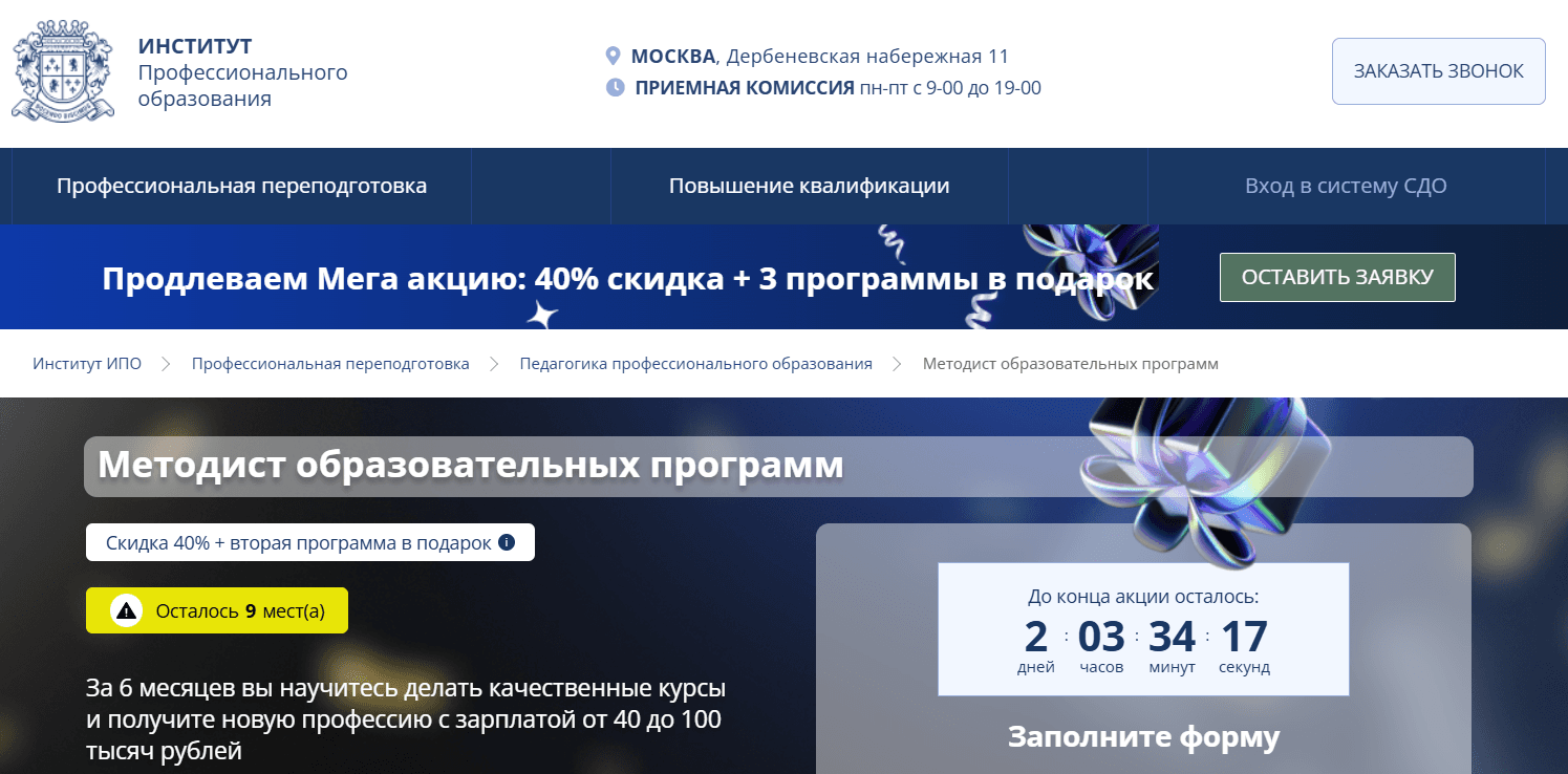 - Ссылка на программу: https://ipo.msk.ru/professionalnaja-perepodgotovka/pedagogika-professionalnogo-obrazovaniya/metodist-obrazovatelnykh-programm-pp/