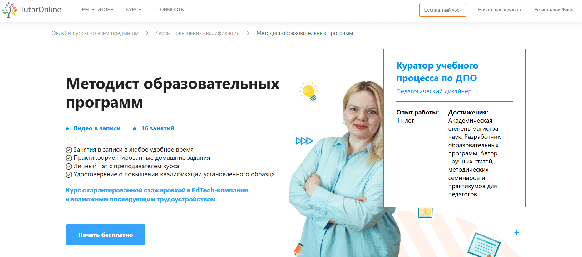 - Ссылка на программу: https://www.tutoronline.ru/online-kursy-povysheniya-kvalifikatsii/metodist-obrazovatelnyh-programm