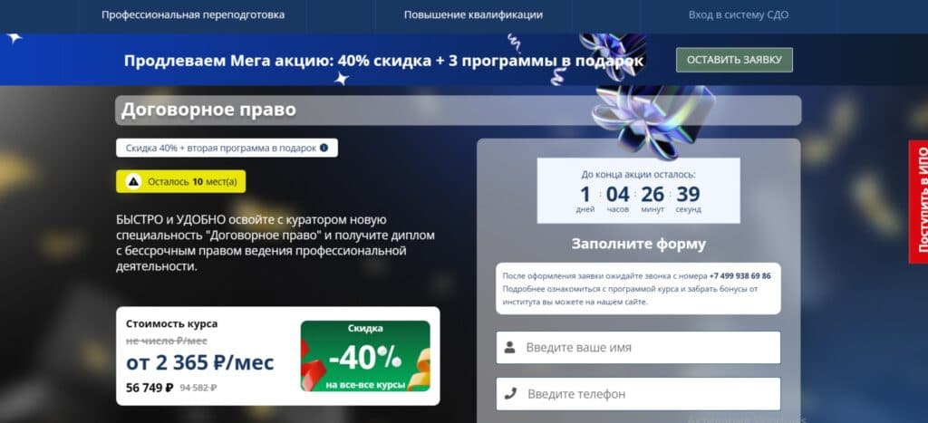 Программа переподготовки по договорному праву направлена на углубленное изучение правового регулирования договорных отношений. Студенты изучают принципы договорного права, особенности составления и исполнения договоров, а также правоприменительную практику в данной области. Программа ориентирована на подготовку специалистов, способных грамотно составлять договоры и разрешать споры, возникающие в процессе их исполнения.