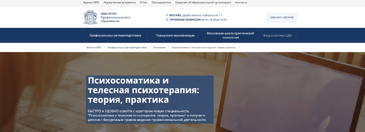 - Ссылка на программу: https://ipo.msk.ru/professionalnaja-perepodgotovka/psihologija/psikhosomatika-i-telesnaya-psikhoterapiya-pp440/