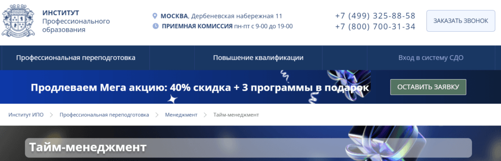 - Ссылка на программу: https://ipo.msk.ru/professionalnaja-perepodgotovka/menedzhment/tajm-menedzhment/