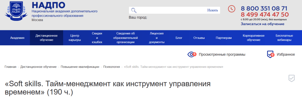 - Ссылка на программу: https://nadpo.ru/do/soft-skills-taym-menedzhment-kak-instrument-upravleniya-vremenem/
