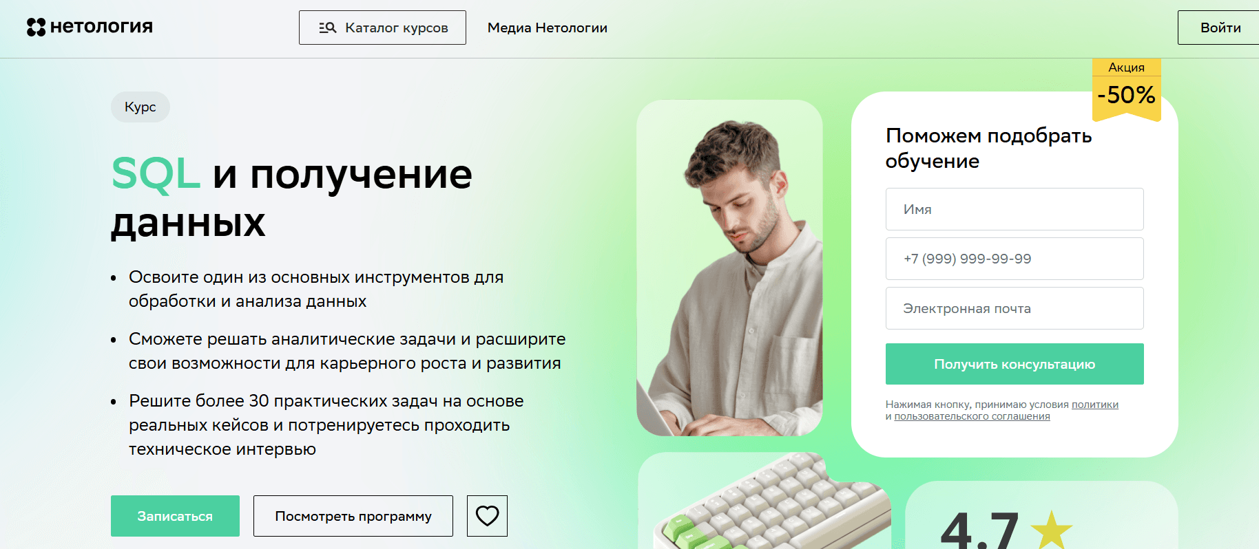 Нетология всегда славилась своей качественной подачей материала, и этот курс не исключение. Мне понравилось, что акцент сделан именно на применение SQL в анализе данных, что было очень актуально для меня как аналитика. Учебные проекты помогли закрепить теорию.